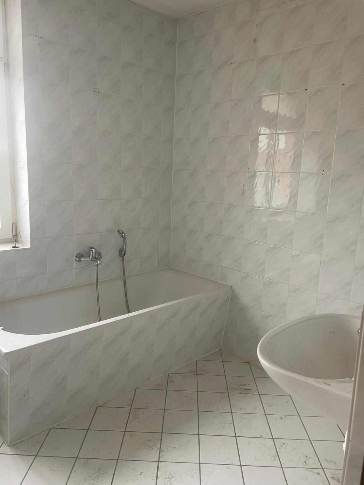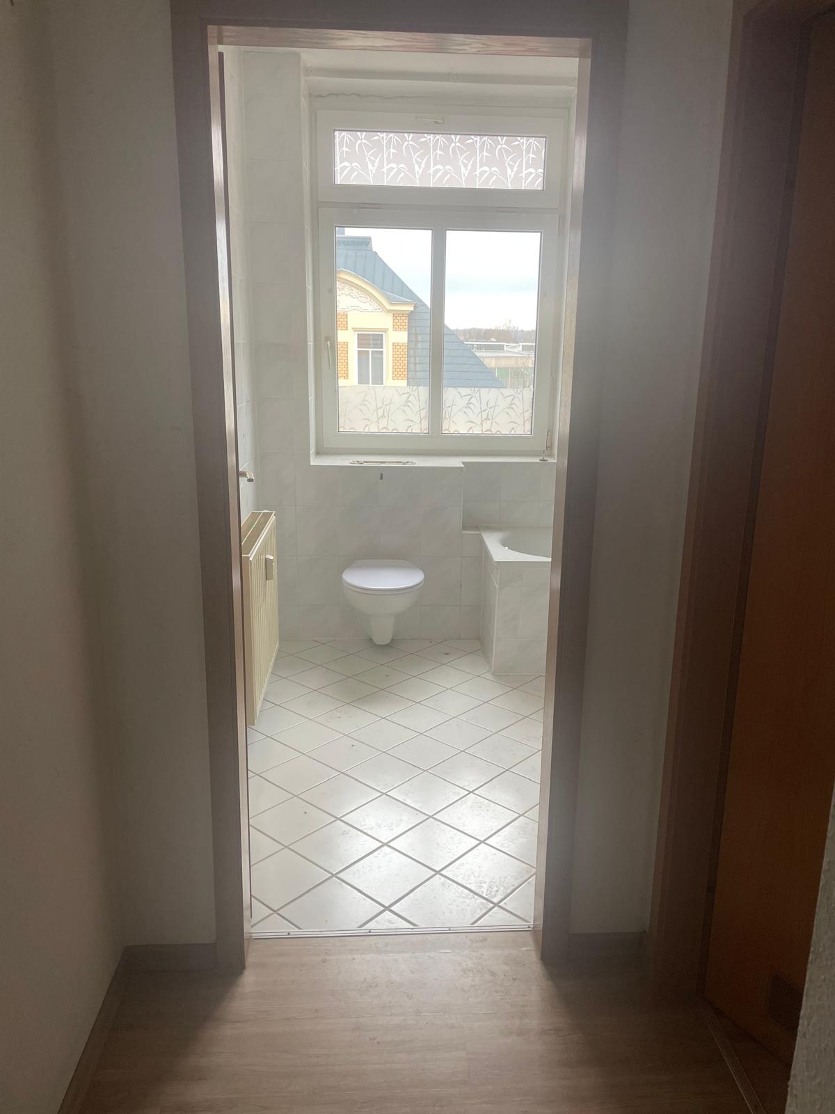 - gefliestes Bad mit Badewanne, Handwaschbecken, WC und Fenster