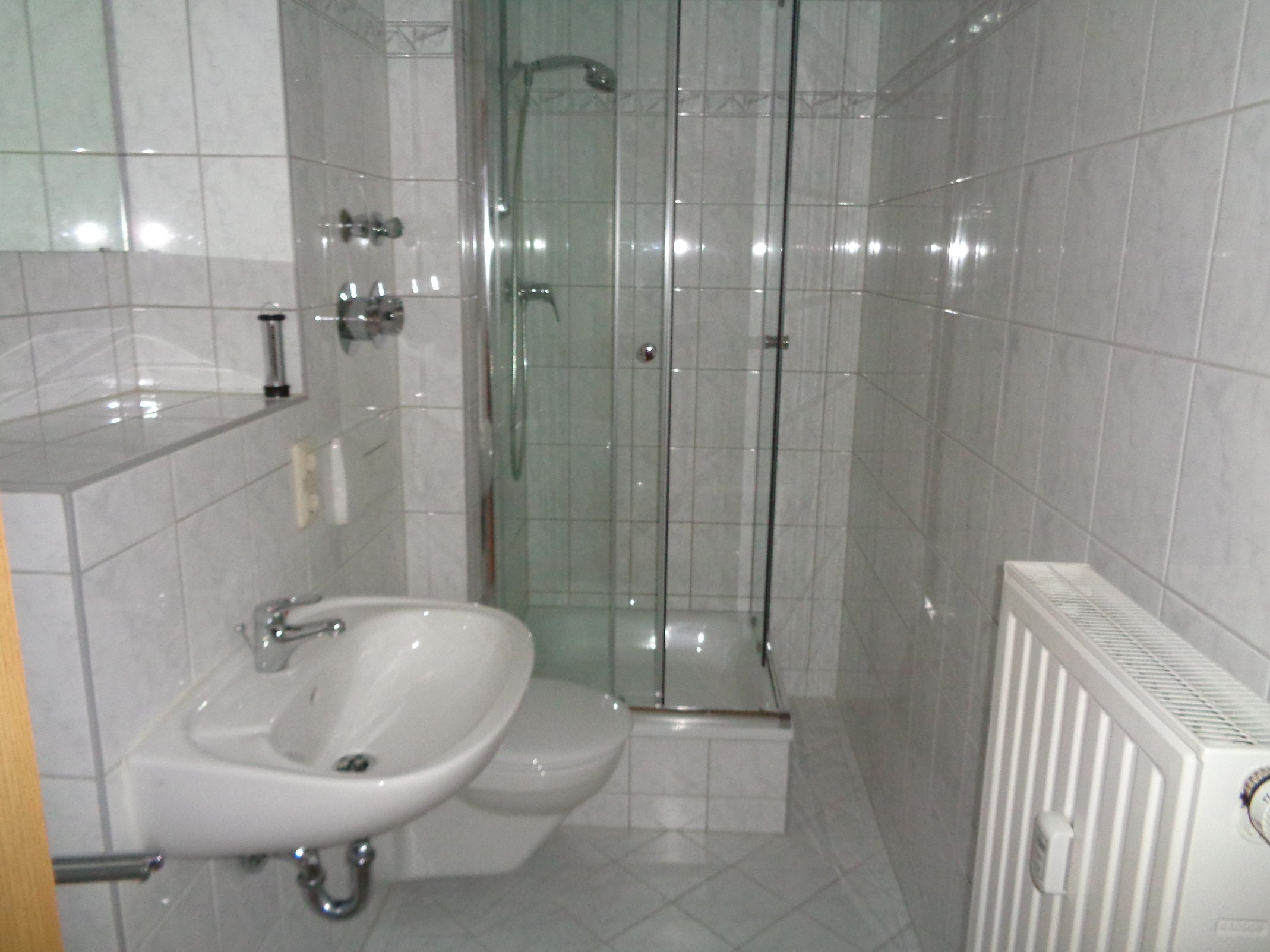 - gefliesten Bad mit Dusche, Handwaschbecken und WC