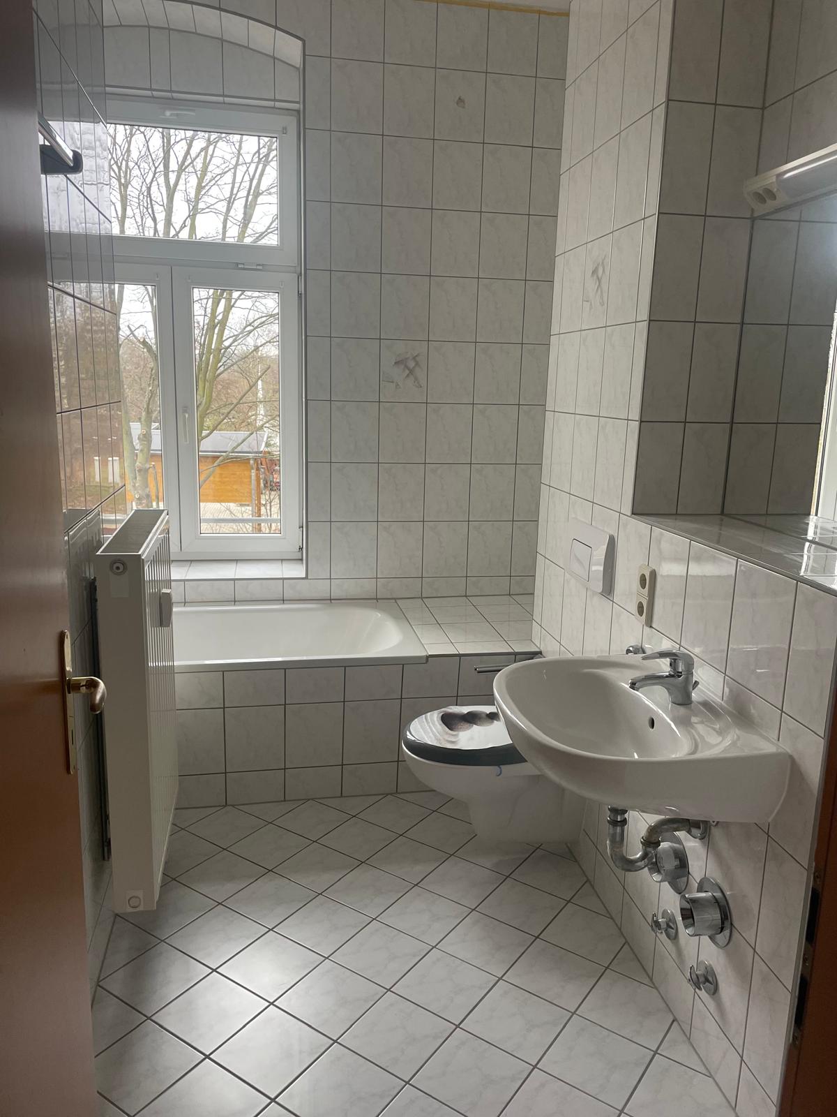 - gefliestes Tageslicht Bad mit Wanne, Handwaschbecken, WC und WM-Anschluss